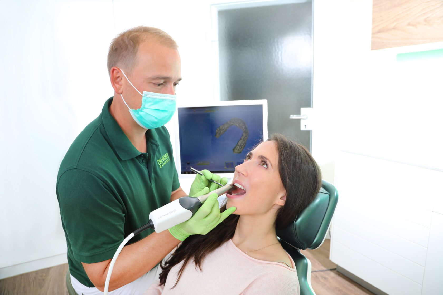 Eine CEREC-Behandlungssitzung läuft folgendermaßen ab: Zunächst wird der Zahn gereinigt und für die Restauration vorbereitet. Mithilfe einer Infrarotkamera, die mit einem Computer verbunden ist, fertigen wir dann eine dreidimensionale Aufnahme Ihres Zahnes an. Ein konventioneller Abdruck, der häufig als sehr unangenehm empfunden wird, ist bei dieser Methode nicht erforderlich.